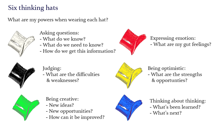 Na het bepalen van doel, doelgroep, tijdsduur, groepsgrootte en dergelijke elementen hebben we een ‘Denkhoeden van de Bono-sessie’ gedaan. Niet met echte hoeden maar met kartonnen vellen en post-its. Duurde iets te lang naar mijn gevoel, doordat ik elke hoed door iedereen heb laten behandelen. Help me eraan denken dat ik het in vervolg verdeel en bij wijze van spreken 5 minuten maximaal per hoed pak. Met het verzamelen van de info en het opschrijven ben je dan toch nog een uur kwijt.