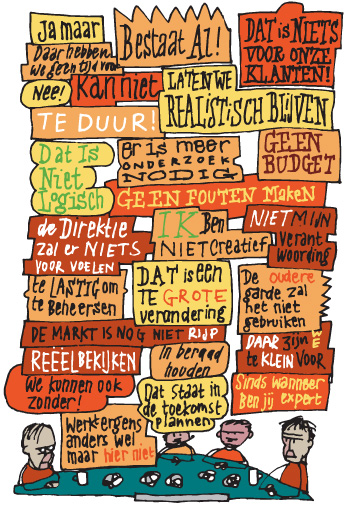 “Ik kan het niet.” “Ik ziet het niet.” “Heb ik geen tijd voor.” “Er is geen geld voor.” “Dat hebben we al eens geprobeerd.”