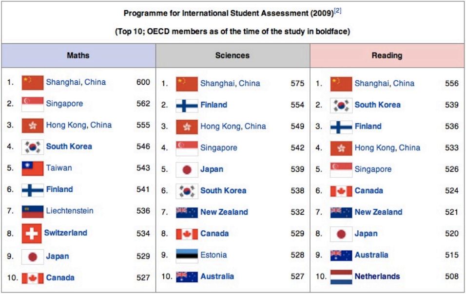 Ik vond het interessant om onderstaande PISA score te zien. Ik dacht altijd dat Finland bovenaan stond. Dat klopt wel als je de scores per land zou bekijken. Maar als je de steden Shanghai of Hong Kong apart scoort, dan ziet het lijstje er ineens heel anders uit. De middenklasse van China besteed 1/3 van inkomen aan onderwijs!