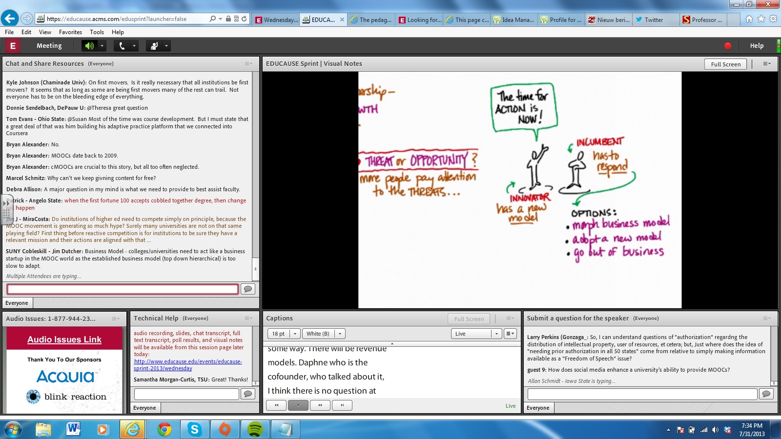 Vandaag was de tweede dag van de Educause Sprint met wederom om 19:00 Amsterdam Time een webinar. 1200 inschrijvers en meer dan 350 actieve deelnemers aan de sessie en ik moet zeggen: wederom veel geleerd. En misschien nog wel beter, connecties gemaakt. Na mijn zeer enthousiaste begin van gisteren ben ik nu een klein beetje getempered. NIet omdat er niet genoeg aan content is gekomen, maar misschien juist dat er veel content is gekomen.