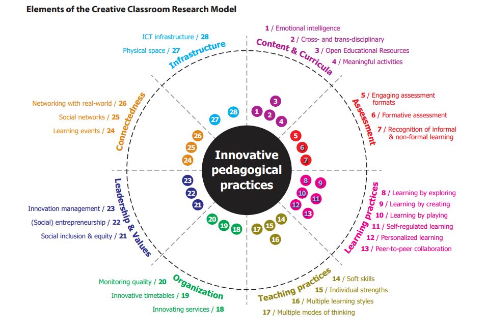 The CCR multi-dimensional concept (8 key dimensions and 28 reference parameters) intends to capture the essential elements of Creative Classrooms which can be seen as ‘live ecosystems’ that constantly evolve over the time, mainly depending on the context and the culture to which they pertain. Focus is on the innovative pedagogical practices and on the systemic approach that is needed for the sustainable implementation and progressively scaling up of ICT-enabled innovative learning environments.