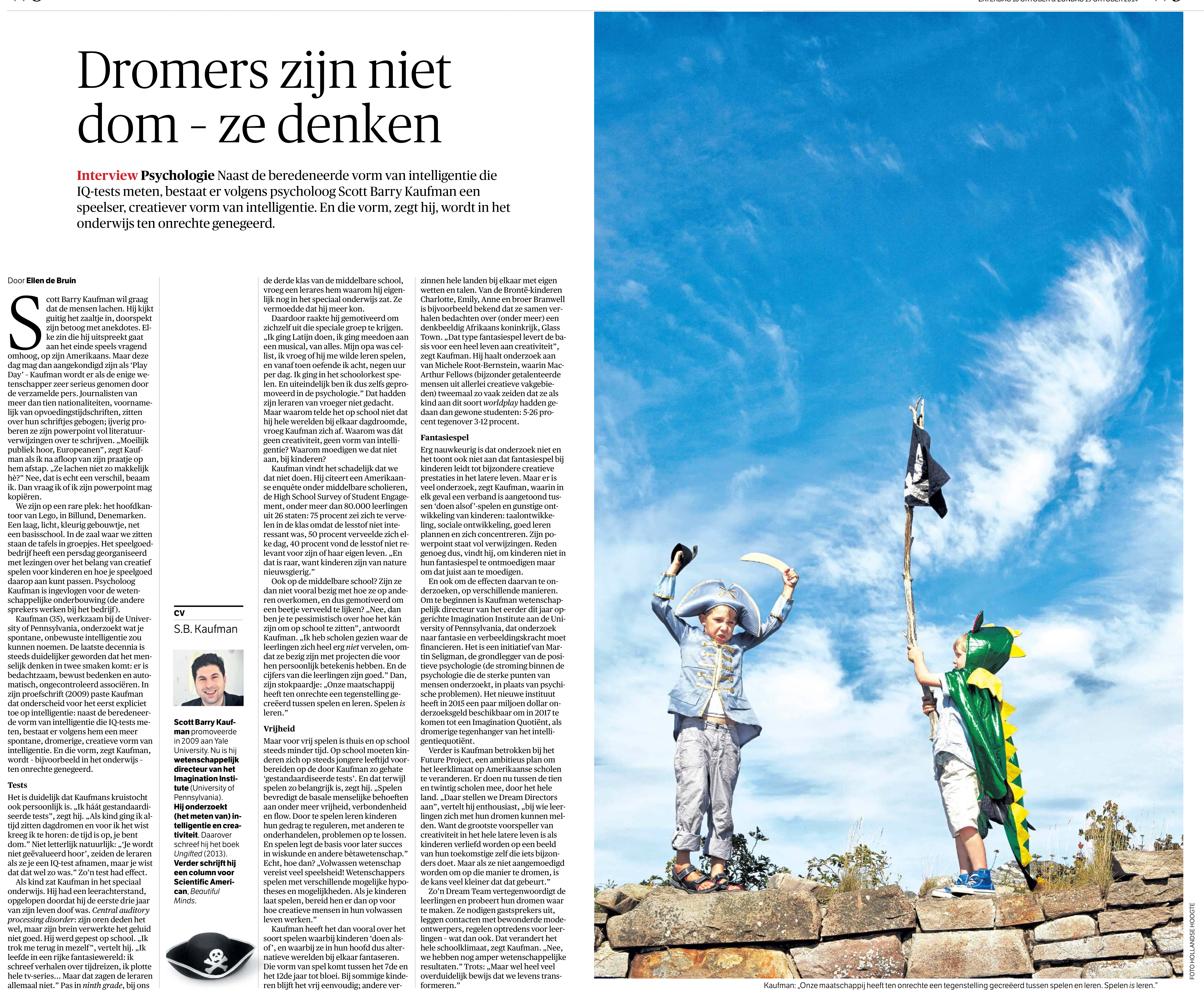 Hoe hoog is jouw Imagination Quotiënt, Marcel? ik vermoed hoog 🙂 . Hoe hoog kan je nog niet weten, omdat het Imagination Institute (University of Pennsylvania) het komende jaar pas gaat proberen te komen tot een Imagionation Quotiënt, de dromerige tegenhanger van dat andere IQ, de Intelligentie Quotiënt. In het artikel uit de NRC van dit weekend: Dromers zijn niet dom – ze denken is psycholoog Scott Barry Kaufman aan het woord. “Spelen is leren”, zegt hij.