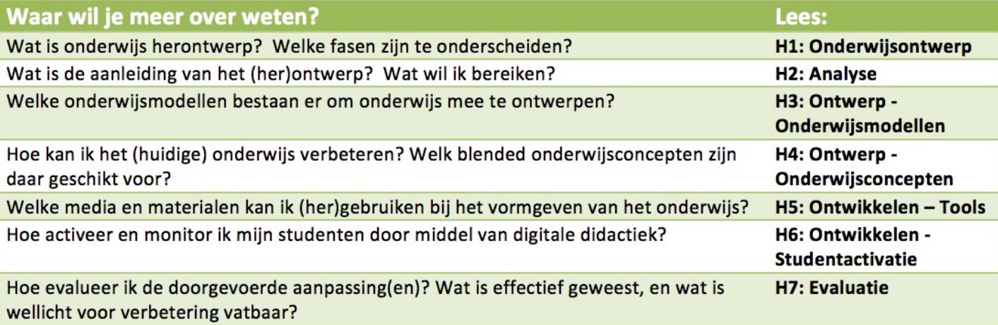 Op basis van het ADDIE model (Analyse, Design, Develop, Implement, Evaluate) worden de vragen die bij herontwerpen centraal staan:
