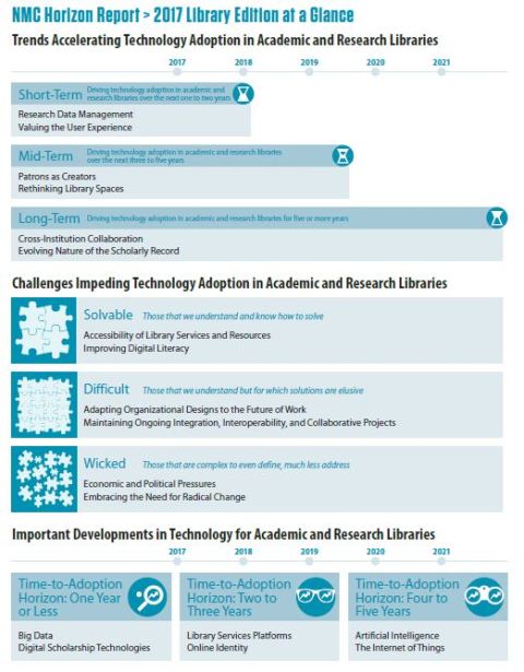 Voor al mijn bibliotheekvrienden deze attendering op het Horizon Report 2017 -> Library Edition. Zoals bij alle Horizon rapporten van NMC worden expert gevraagd naar technologische ontwikkelingen, in dit geval in het bibliotheekvak. Ook hier worden trends en uitdagingen op korte, middellange en lange termijn benoemd. Zie onderstaande samenvatting uit het rapport.