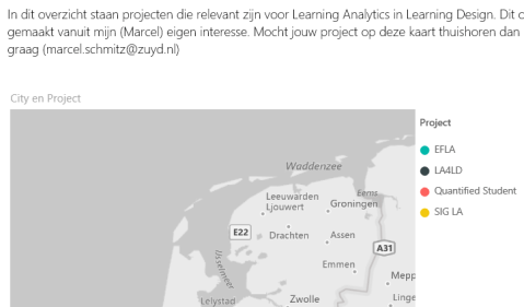 Het resultaat: een kaart met stippen waar projecten te vinden zijn. Dit is nu een blogpost, maar als ik dadelijk helemaal door heb hoe het werkt wil ik er op ons blog een vaste pagina van maken. Als ik het goed begrijp kan ik vanaf nu mijn Excel sheet updaten, bij PowerBI een ververs actie opstarten en dan zou het ge-embedde iframe ook moeten updaten. Ik ben benieuwd en je zal weten zodra het gelukt is als je een verandering ziet. In de beginstand heb ik drie projecten benoemd: Mijn eigen project LA4LD, Quantified Student die donderdag 11 januari een conferentie hebben waar ik helaas niet bij kan zijn en EFLA de tool om Learning Analytics Tools op Usability mee te testen van mijn OU collega Maren Scheffel. In de toevoeging zal ik bij Utrecht een vermelding maken van de SIG Learning Analytics.