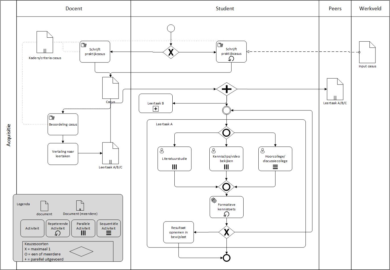 In onderstaande afbeelding wordt een voorbeeldscript of activiteitendiagram getoond voor de acquisitiemetafoor. In dit voorbeeldscript zijn verschillende leeractiviteiten met hun eventuele volgordelijkheid te vinden, gekoppeld aan de verschillende actoren die binnen Zuyd een rol (kunnen) spelen (de kolommen in het diagram). Voor de verschillende leeractiviteiten zijn verschillende mogelijkheden voor (technologische) tools.