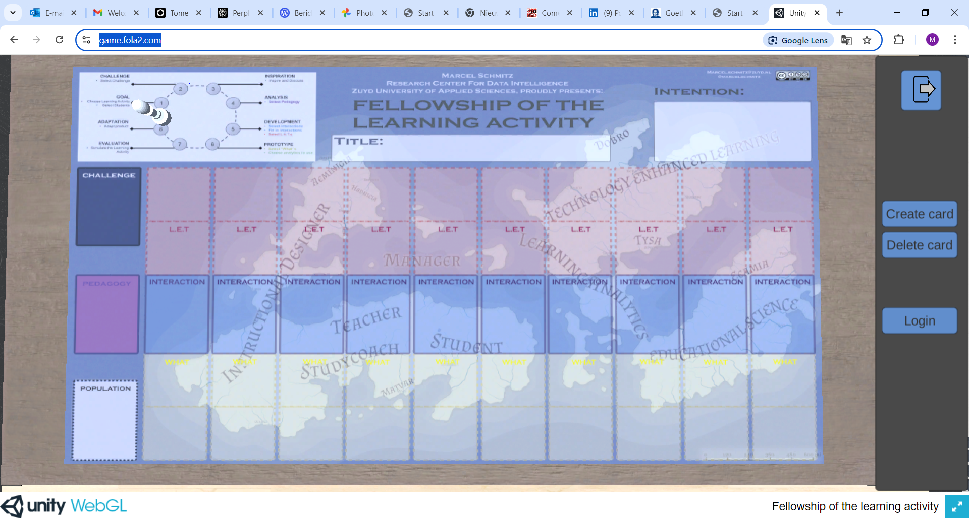 De look en feel (qua kleuren van de kaarten) is iets anders en ze hebben mogelijkheden gecreëerd zodat je meer details kunt meegeven bij de interacties, je kunt niet met rollen spelen en er is geen discussie over de populatie waarvoor je de leeractiviteit maakt, maar de basis van het neerleggen van interacties, het nadenken over welke technologie kan deze interactie versterken en het nadenken over wat je wil weten, welke data daar bij komt kijken en hoe en welke metingen er daarvoor gedaan moeten worden zit in dit spel. In vergelijk met de digitale kopie van het spelbord die Shannen Dolls met haar groep ooit heel snel voor me in Unity heeft gemaakt is de omgeving van Frankfurt een omgeving waarin je met meerdere mensen kunt samenwerken en eigen kaartensets kunt maken.