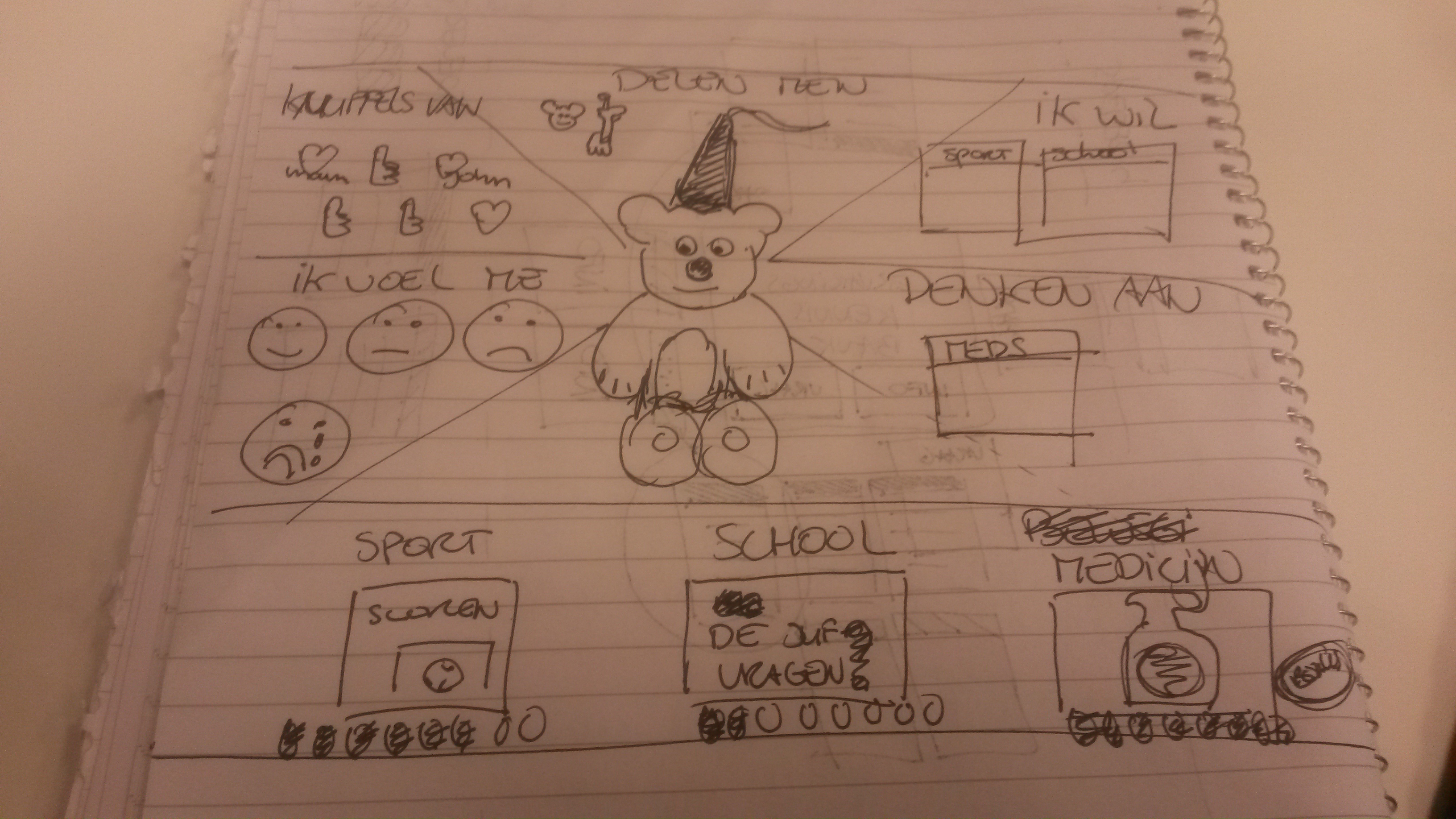 Vanuit een spelgedachte laten we ons inspireren door theSims, FLUXX, Kamergotchi the American Horsepower Challenge en natuurlijk SuperBetter. De dames zijn aan de beurt en ook dit is maar een eerste schets van mijn idee van de view voor het kind.