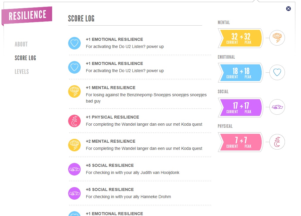 In een score log kun je zien waarom je bij welke categorie punten hebt gescoord. Emotionele punten krijg ik bijvoorbeeld als ik naar U2 luister. Mental Resilience op het moment dat ik na het tanken geen snoep heb gekocht. Physieke weerstand nadat ik met Koda heb gewandeld. En Sociale weerstand als ik heb ingechecked bij jouw Judith als een van mijn Allies.