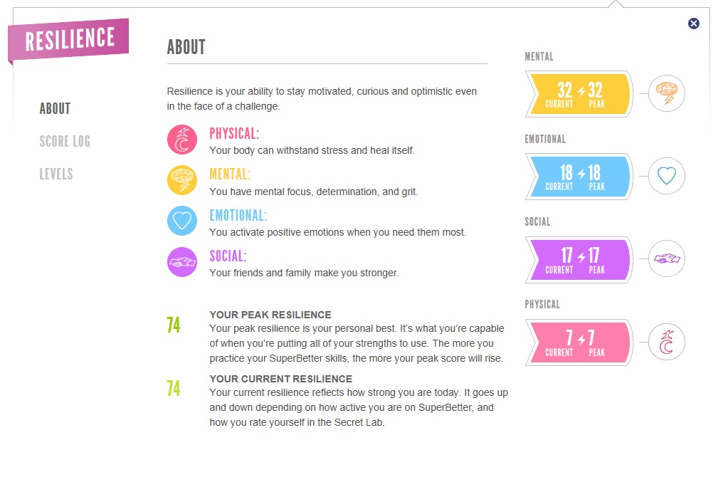 Ik heb Erik ‘het’ boek uitgeleend. Ik had het uitgeleend aan Sandra, die het zo inspirerend vond dat ze erin geschreven had en mij (en Melanie) een nieuwe heeft gekocht. Erg jammer 😉 Ik had graag haar aantekeningen gezien, wellicht krijg ik haar nog zo ver om eens te bloggen over wat zei van het boek vond. Ik had dus een nieuwe versie gekregen van Sandra en heb hem gelijk al overgedragen aan Erik (de Engelse versie heb ik zelf nog hoor!). Hij werd pas echt enthousiast toen ik begon te vertellen over SuperBetter en het opbouwen van Resilience (weerstand) wat het belangrijkste feedbackmechanisme is bij dat online spel. Ik ben erg benieuwd naar de onderzoeken over Resilience waarmee Erik en zijn team bezig zijn. In deze post loop ik door een aantal screenshots van SuperBetter om hopelijk een heel kort inzicht te geven in de game: SuperBetter.