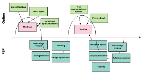 n dit voorbeeld is uitgewerkt dat 80% van de leeractiviteiten zich face-to-face afspelen en 20% online. De student moet literatuur lezen waarvan de gegevens en eventueel de linken, zijn opgenomen in de online leeromgeving. Ook vindt de student hier een video die hij moet kijken en een link naar een individuele opdracht. Dit tezamen is input voor het maken van een (online) mindmap. Vervolgens heeft hij allerlei face-to-face bijeenkomsten, zoals het volgen van een hoorcollege, het bijwonen van training, een tutorbijeenkomst enzovoort. Hierna werkt de student online samen met medestudenten aan een groepsopdracht en voorzien ze elkaar van peerfeedback. Hierna volgen allerlei face-to-face bijeenkomsten.