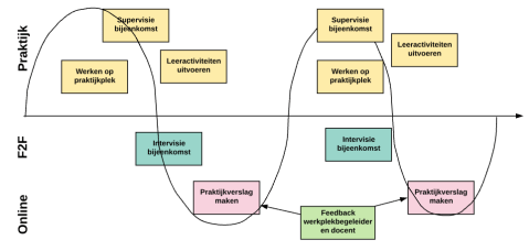 In dit voorbeeld is uitgewerkt dat 80% van de leeractiviteiten zich afspelen in de praktijk (bijvoorbeeld tijdens een stage), 5% online en 15% op school. De student is aan het werk op een praktijkplek, dat kan bijvoorbeeld stage zijn maar in het geval van een deeltijdstudent, ook de eigen werkplek. Daar voert zij ongeveer 80% van de leeractiviteiten uit. Op school vindt met enige regelmaat intervisie-bijeenkomsten plaats met een docent en daarnaast werkt de student aan een praktijkverslag online waarbij ze ook online feedback ontvangt van haar supervisor en docent.