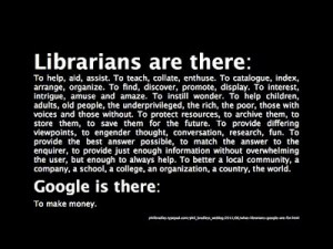 Binnen bibliotheekwereld is de laatste maand veel gezegd en geschreven over de toekomst van het beroep. Mijn vakblad InformatieProfessional heeft in het jubileumnummer van april 2012 een artikel gewijd aan het congres van de Koninklijke Bibliotheek ‘De bibliotheek in 2025‘ en diverse collega’s kijken in ‘En wat verwachten we van de komende 15 jaar’ vooruit naar mijn vak in 2027 (iew, dan ben ik misschien al met pensioen). Samen met mijn collega’s van Zuyd Bibliotheek heb ik op 22 maart gediscussieerd over de stellingen: ‘De bibliothecaris heet in 2020 informatieadviseur en is in dienst bij een kenniscentrum’ en ‘Voor het runnen van de fysieke bibliotheek is een bibliothecaris niet meer nodig’. Daarnaast ben ik een paar weken geleden naar de Meet-the-Expert bijeenkomst geweest over de toekomst over hoger onderwijs en bibliotheek.
