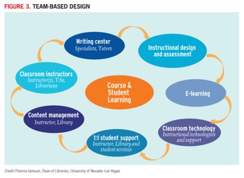 The team-based model asks not only how all of these instructional experts might collaborate with faculty on a new design but also how some of them (e.g., embedded librarians) might play a role in the delivery of the course so that not all of the burden of the expanded instructional model falls on the instructor.