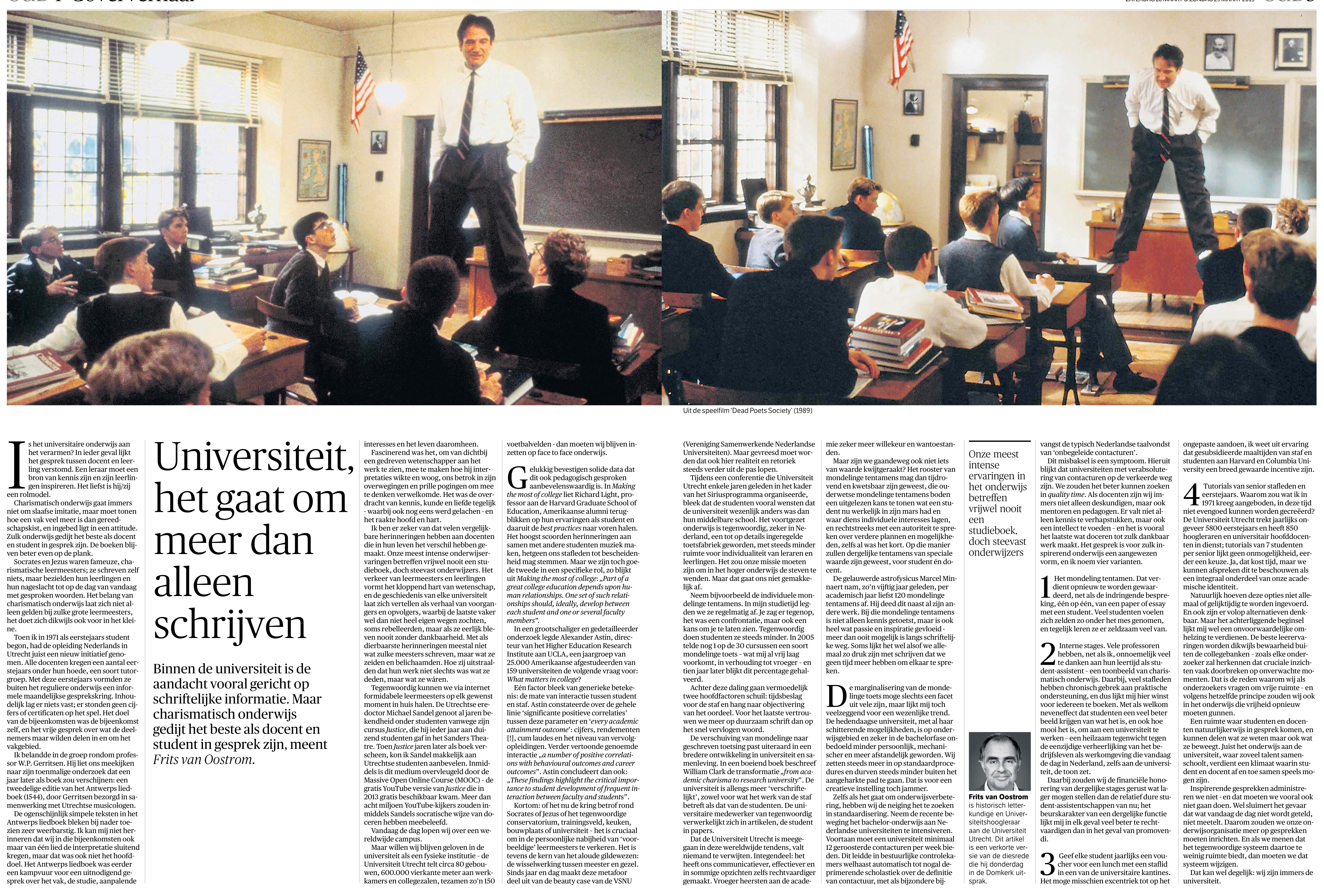Wie maakt uiteindelijk het verschil in het onderwijs? De docent, de gepassioneerde docent. Uit onderzoek (!) is gebleken dat de interactie tussen studenten en docenten een significante positieve correlatie heeft met de oh zo belangrijke outcomes: cijfers, rendementen. Het is, zegt van Oostrom “cruciaal om in de persoonlijke nabijheid van ‘voorbeeldige’ leermeersters te verkeren”, de kern van het aloude gildewezen. Hij pleit oa. voor het opnieuw waarderen van het mondeling tentamen. Volgens hem wordt dat nu bijna niet meer gedaan vanwege de grote tijdsinvestering en “de hang naar objectivering van het oordeel”. Het bachelor-onderwijs is te veel gestandaardiseerd geworden en daardoor onpersoonlijker. We moeten het meer zoeken in quality time en niet alleen binnen de ‘geroosterde en onbegeleide contacturen’ …. Zijn voorstel om elke student jaarlijks een voucher te geven voor een lunch met een docent, lijkt me een waardevolle. Op universiteiten als Harvard en Columbia University waar dit gebruikelijk is, wordt dit zeer gewaardeerd. De vraag of dit dan als ‘contactuur’ telt en dus meetelt in het takenplaatje van de docent en de studietaakbelasting van de student wil je eigenlijk helemaal niet beantwoorden. Oostrom greep ook terug op wat hij zelf als eerstejaars als zeer waardevol heeft ervaren: tutorgroepen van docenten met een groep eerstejaars studenten. Zo’n groep komt maandelijks informeel bij elkaar, buiten het reguliere onderwijs dus. Er staat niets tegenover: geen cijfers of certificaten. Het doel is de bijeenkomst zelf, het vrije gesprek over wat deelnemers maar wilden delen in en om het vakgebied. Een soort ‘dead poets society’ 🙂