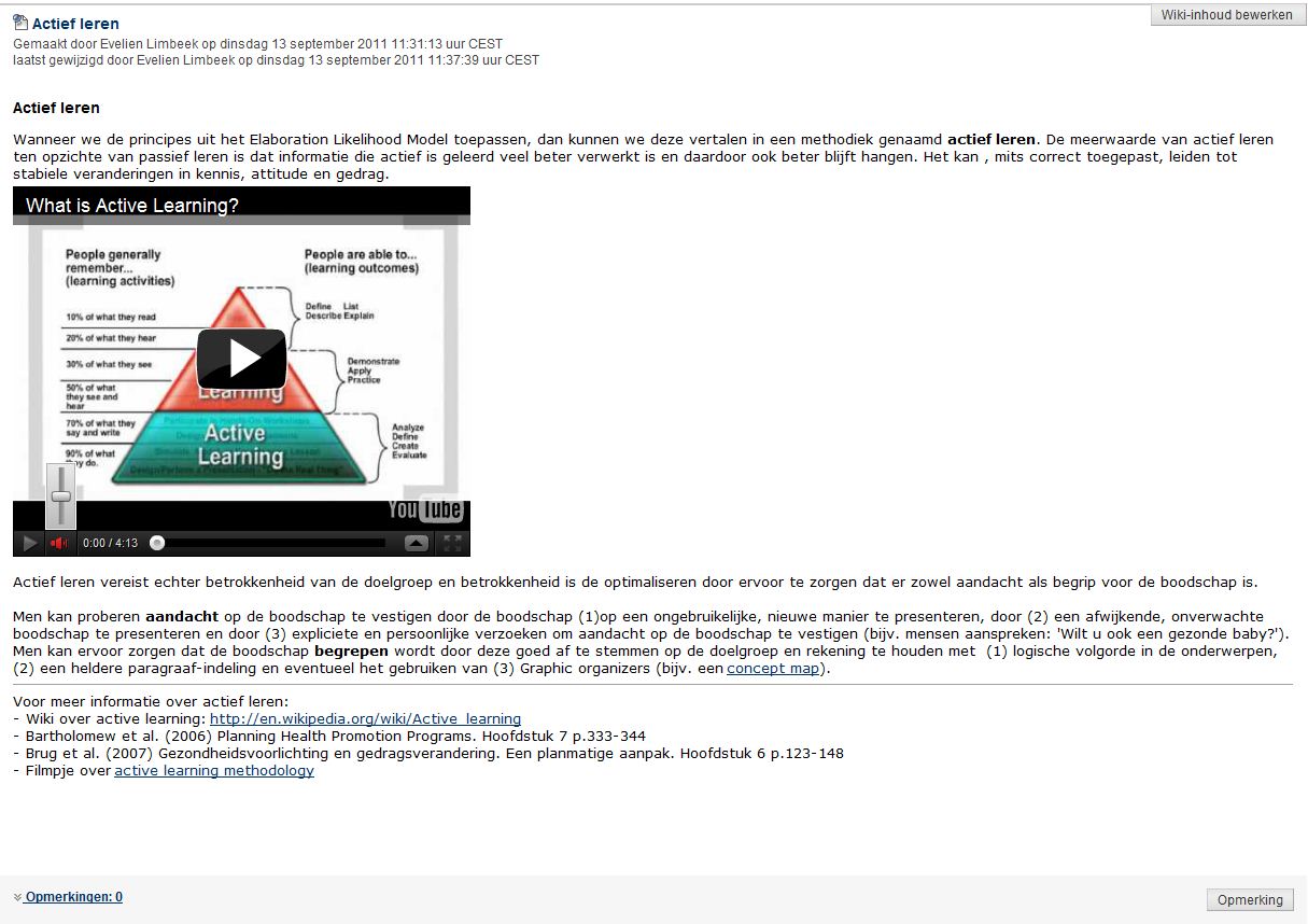 Voorheen werden deze methoden en theorieën in PGO-onderwijsgroep bestudeerd. Evelien vond dat de studenten door inzetten van de wiki actiever met de stof bezig waren en deze beter beheersen en daarmee een betere keuze konden maken in de ontwikkeling van hun gezondheidsbevorderende interventie. De studenten konden in het afsluitend college aan de hand van de wiki de kennis goed over te dragen aan hun medestudenten. Tijdens dit college werd in tegen stelling tot wiki volop gereageerd, het samenwerkend leereffect is iets dat Evelien een volgende keer wil bereiken.
