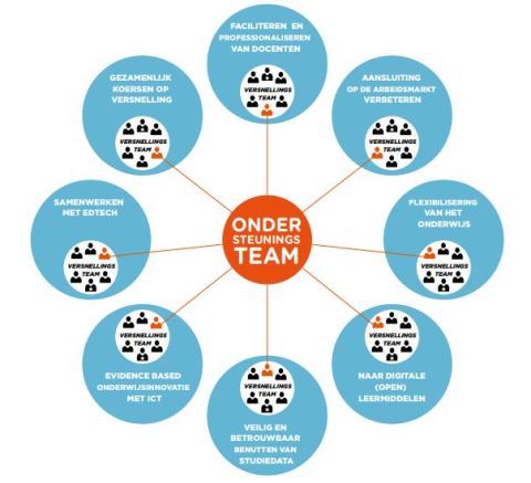 Elke zone krijgt een versnellingsteam met 5-8 teamleden. Zij bepalen samen de vraagstukken, het tempo en de aanpak om te komen tot schaalbare resultaten. De versnellingsteams worden geholpen door een ondersteuningsteam met technische, beleidsmatige en juridische expertise. Het ondersteuningsteam legt ook de verbindingen tussen de verschillende versnellingsteams. Daarnaast voert een programmateam en een stuurgroep de regie over het programma. Het programma wordt gefinancierd door middel van projecten/mensuren in en door de deelnemende instellingen. Van de bijdragen van VH, VSNU, SURF en OCW wordt het centrale ondersteuningsteam en de aanvoerders (0,4 fte) van versnellingsteams gefinancierd. In elk versnellingsteam zit een verbinder (0,3 fte) uit het ondersteuningsteam. Het is ook de bedoeling dat in elk versnellingsteam een student participeert. Er is ook volop ondersteuning voor uitwerking van concrete producten en resultaten. Tevens is er gedurende het programma veel aandacht voor disseminatie.