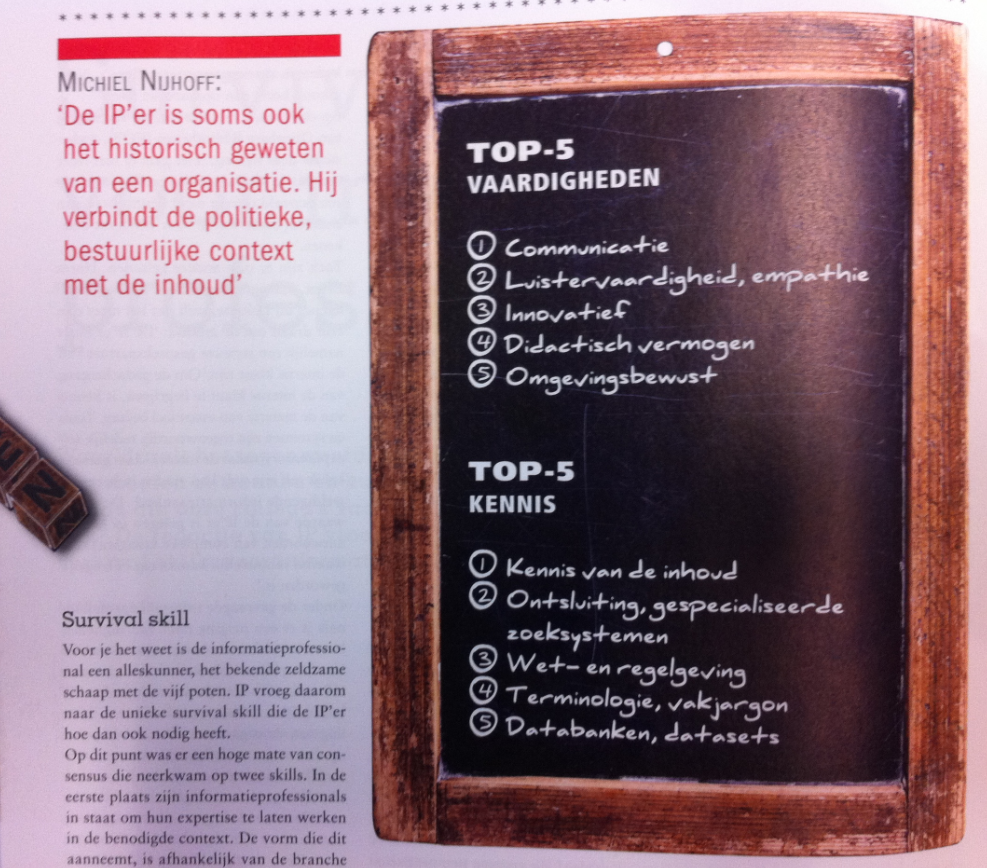 Bij de IM-Zuyd omschrijving staat: “de IM’er is de ‘linking pin’ tussen business en ICT. Je werkt mee aan het ontwerpen, verbeteren en implementeren (invoeren) van informatiesystemen. En hoewel op het eind wel sociale media genoemd wordt, vraag ik me ook wat de rol van communicatie en media is in jullie opleiding. Uit het artikel blijkt dat contacten opbouwen met klanten, ook online en via sociale media, belangrijk is voor de informatieprofessional. Het gezicht achter de dienstverlening wordt steeds belangrijker. “Het gaat er niet meer om dat je als informatieprofessional op een bepaald terrein meer kennis hebt dan anderen, maar wat je voor hen kunt betekenen”. Uit de discussie over wat nu belangrijker is voor de informatieprofessional: vaardigheden of inhoudelijke kennis?, komt eigenlijk naar voren dat hij/zij vooral nieuwsgierig moet zijn, én flexibel. “Een informatieprofessional is in staat zijn expertise te laten werken in de benodigde context”. De afbeelding hieronder laat de top 5 aan vaardigheden en kennis zien, volgens het werkveld. Ik onderschrijf die wel 🙂