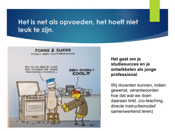 Ilse en haar collega hebben na het eerste kwartaal deze aanpak met de studenten geëvalueerd. Studenten waren niet onverdeeld enthousiast. Ze vinden de lessen te lang, de groep te groot. Waarom de groep niet in twee splitsen? De docenten hebben teruggekoppeld waarom voor deze aanpak (vanuit de onderwijsvisie) is gekozen. In het blogbericht Staan voor de visie beschrijft Ilse welke feedback zij hebben ontvangen op basis van enquête en wandelgangen. Dapper om groepen studenten die in de weerstand zitten te vertellen waarom je de dingen doet zoals je ze doet. En soms hoeft het niet altijd leuk te zijn.