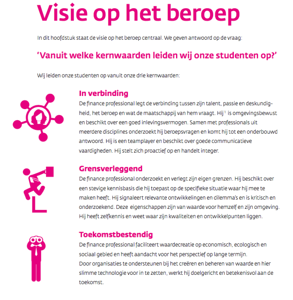 Samen duurzaam ontwikkelen in een uitdagende praktijkgerichte financiële omgeving zodat de student met zijn deskundigheid, passie en talent kan werken aan zijn eigen toekomst en kan bijdragen aan de veranderende maatschappij. Dit doen wij door te werken vanuit onze kernwaarden.