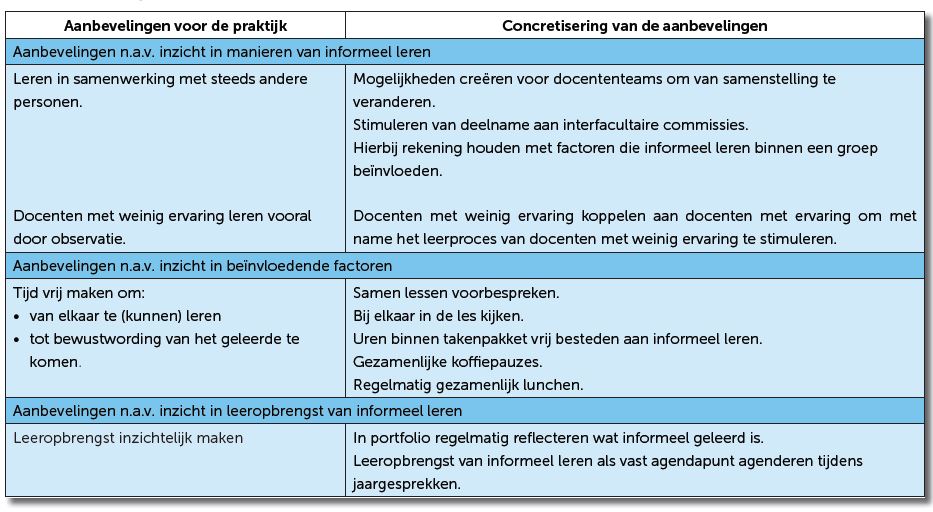 Collega Myriam Lamerichs heeft net als ik voor de Master Leren en Innoveren onderzoek gedaan bij de faculteit gezondheidszorg. Haar onderzoek bestond uit tiental interviews met docenten van de opleiding fysiotherapie en biometrie. Mijn onderzoek bestond uit een digitale vragenlijst aan alle docenten van de opleiding ergotherapie. Myriam heeft docenten gevraagd hoe ze informeel leren en wat ze informeel geleerd hebben. Ik heb vooral gefocust op hun digitale competenties om te professionaliseren via sociale netwerken, ofwel social learning. In haar onderzoek concludeert Myriam dat docenten vooral leren door te observeren (kunst van het afkijken) en door interactie met (ervaren) collega’s. Uit mijn onderzoek bleek dat ook. De voorwaarden om informeel of sociaal te leren komen overeen zoals veilige sfeer, open communicatie en positieve emoties. Zowel informeel leren als social learning geschiedt voornamelijk door ervaringsleren, door sociale interactie en door te reflecteren.