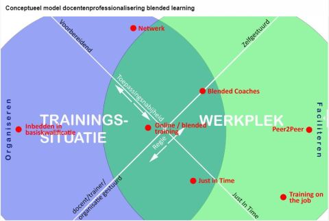 Voor het adoptieproces is naast faciliteren, ondersteunen en ontzorgen van docenten, ook het professionaliseren belangrijk. Bij Zuyd wordt momenteel het hele aanbod van docentprofessionalisering door HR in kaart gebracht en wordt een uitvoeringsorganisatie ingericht. Dat is een goede stap. Buttom up is al jarenlang gevraagd om docentprofessionalisering. Er moet nu gestuurd. Ik zag een mooi conceptueel model docentprofessionalisering blended learning waarop je keuzes kunt maken. Immers de ene vorm is niet beter dan de ander. Het hangt van de context af. [Todo: plaatje doorgeven aan HR-collega].