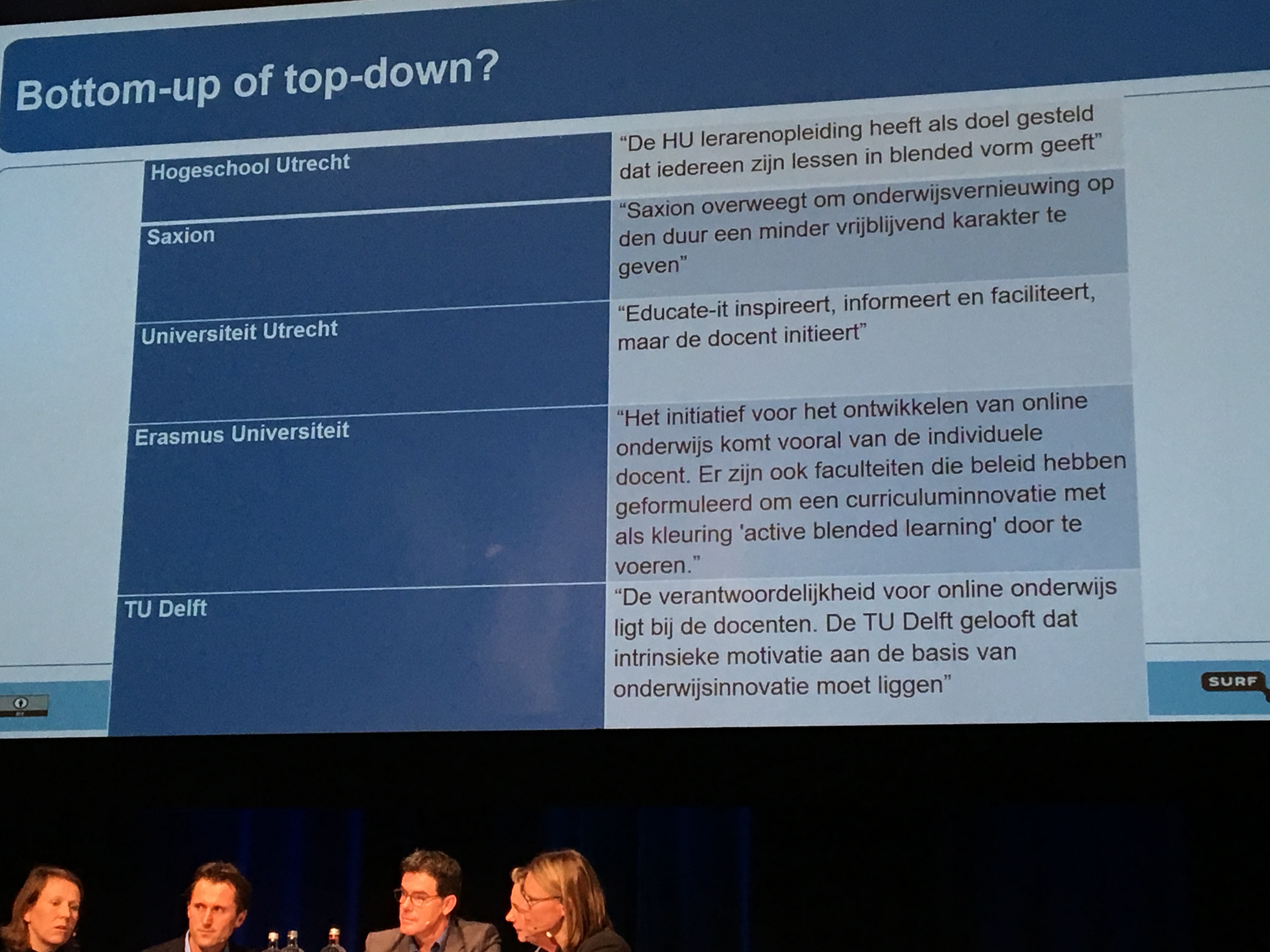 De dag begon met de uitreiking van de SURF Onderwijsawards die dit jaar voor het eerst uitgereikt werden. Een bestuurder, een docent en een onderwijsprofessional die als change makers het onderwijs vernieuwen met inzet van ict werden in het zonnetje gezet. En hoewel ze alle drie (docent Farshida Zafar van Erasmus Universiteit; Jan Haarhuis van Universiteit Utrecht; Anka Mulder, TU Delft) het verdienen om deze prijs te winnen, vond ik het jammer dat er alleen winnaars waren uit de universitaire wereld. Waar zijn de change makers uit HBO en MBO?