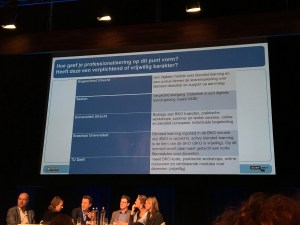 De leerervaring, de 21-century skills (zonder die term eigenlijk gehoord te hebben) van studenten en de aansluiting op de beroepspraktijk kwam ook veelvuldig ter sprake. Als je alleen zendt, zei Maurits Berger, mis je iets essentieels in het onderwijs en dat is hoe je je kennis inzet. Je weet van alles maar je kunt er niets mee. Dit sluit aan op slotconclusie van Deborah Nas tijdens de eerste keynote op woensdagochtend: “We moeten onze studenten en docenten leren leren. Technologie kan dit faciliteren”. Van haar keynote werd ik blij, zoveel geweldige toepassingen die ik nog niet ken kwamen voorbij. Zij zei ook dat we technologie beoordelen vanuit je eigen (oude bestaande) referentiekader. Wat als boeken na videogames waren uitgevonden, wat zouden we dan van lezen vinden? We moeten mensen helpen te ‘reframen’, mensen moeten wennen aan nieuwe technologie, dat helpt bij de adoptie. Deborah liet zien dan de wereld om ons heen zo snel verandert dat kunnen we als instituut onderwijs niet bijhouden. Het is bijna onmogelijk om te bedenken hoe de wereld er over 5 jaar uit ziet als je ziet wat er de afgelopen 5 jaar allemaal technisch mogelijk is geworden. We moeten beter leren begrijpen waarom docenten iets niet willen inzetten en hen helpen. Denk vanuit mogelijkheden in plaats van problemen, dat zei Maurits Berger letterlijk en Deborah Nas bedoelde het ook zo.
