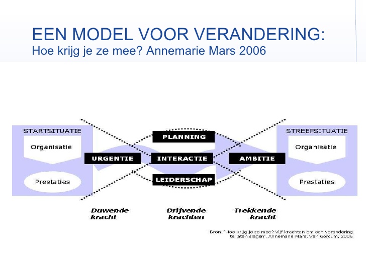 Interactie is het hart van dit krachtenmodel! Bij het introduceren van het veranderverhaal ontstaan de weerstanden. Communiceren, communiceren, communiceren, zegt Mars, met dien verstande dat het een tweerichtingenverkeer is. En ik pleit dan natuurlijk om dit ook met digitale middelen te ondersteunen 🙂 daarover gaat mijn leerinterventie. Hoewel er altijd groepen blijven met een relatieve informatieachterstand moet je er voor zorgen dat die achterstand zo klein mogelijk is.