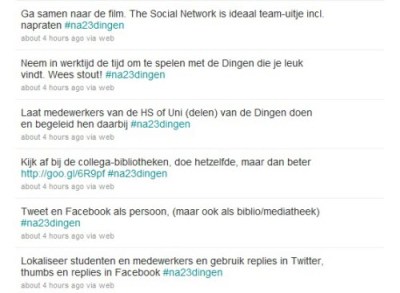 Door mijn acties rondom KiB2.0 ben ik weer met de twitterfountain aan de slag. Het ‘edusocmedia’ is toch mijn droom die ik uit LA mee heb meegenomen. Dat wat ik gezien heb is inmiddels in een notitie rondom Bibliotheek Zuyd & Social Media verwerkt. A.s. dinsdag ga ik hierover met de bibliothecarissen discussiëren.