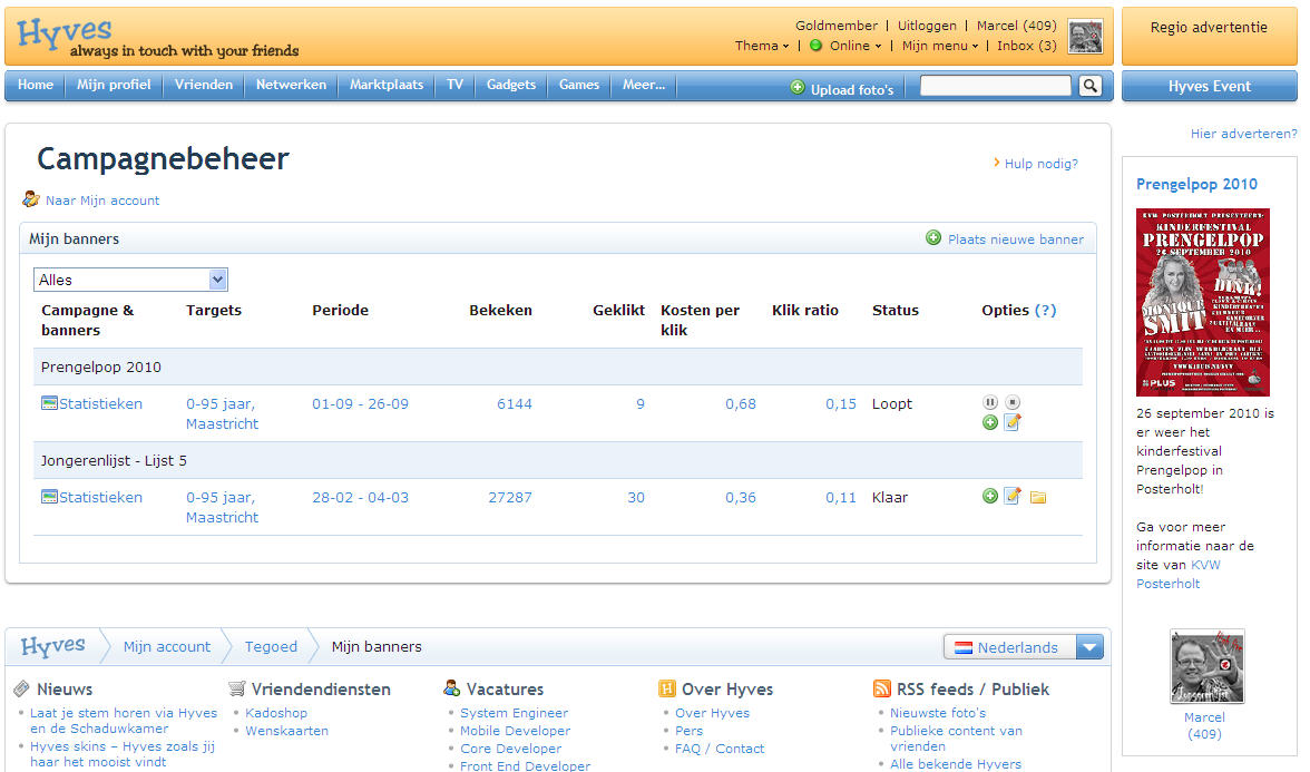Het blijft een vraag bij de tools. Hoeveel wordt er nu echt gebruik van gemaakt. Ik bedoel het aanmaken van een account is snel gedaan. Maar hoeveel wordt er nu echt gebruik gemaakt van tools zoals Hyves, Facebook, Twitter of Yammer. En waar ik ook nieuwsgierig naar ben hoeveel van de elementen van die tools wordt echt benut. Ik bedoel van het hele Office pakket gebruiken we ook maar een aantal tientallen procent. Dat zal ook zo zijn met de Web 2.0. tools. En hoe waardevol zijn die elementen dan. Zo heb ik afgelopen week een Hyves-Advertentie voor 25 euro in de wereld gestuurd. Ik heb de regio Maastricht gekozen, 25.000 views maximaal, geen leeftijdscategorie. En als je dan nu na het weekend kijkt dan zijn je allerlei statistieken.