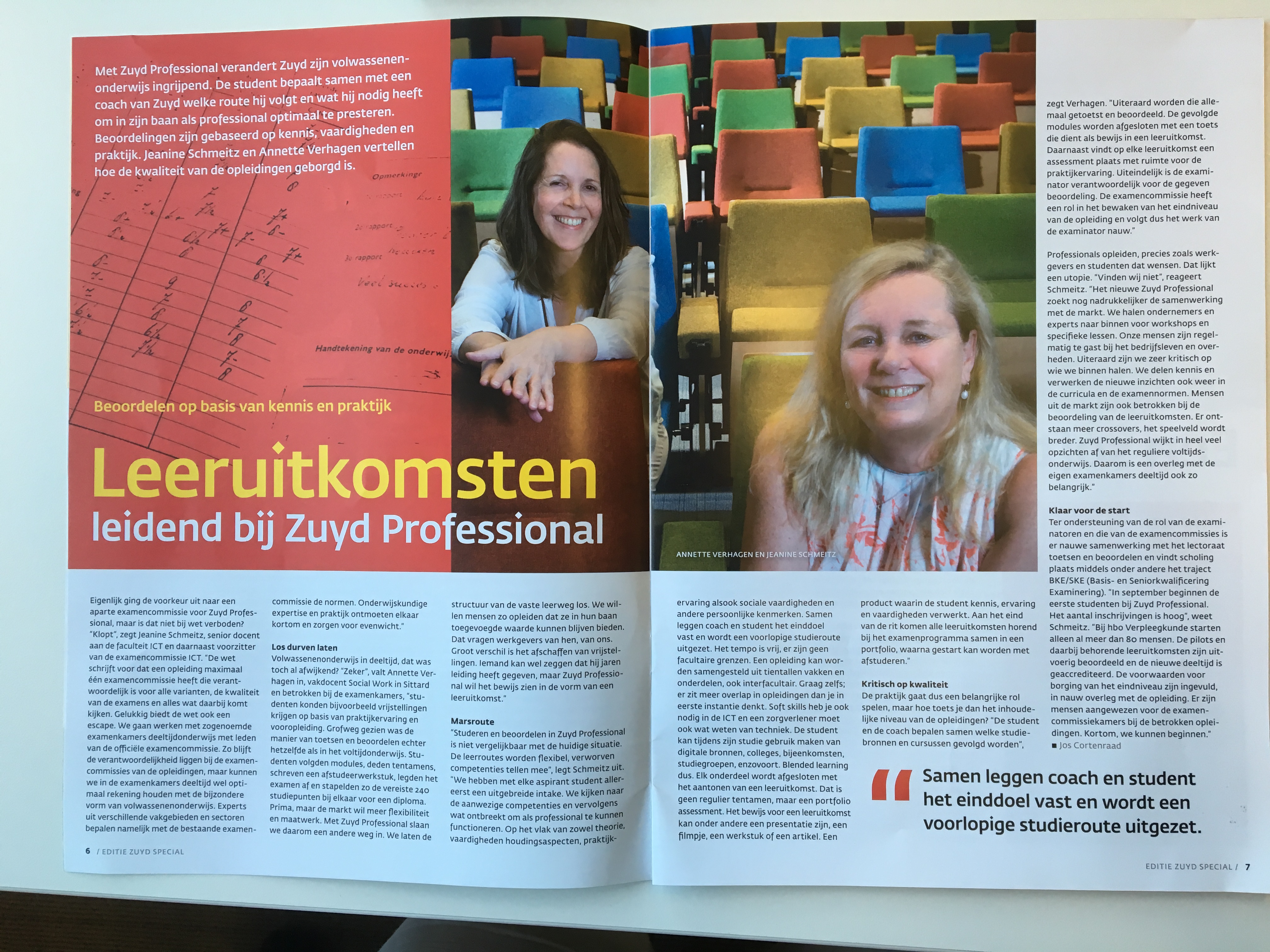 Het meest lezenswaardig vond ik onderstaand artikel waarin Jeanine Schmeitz helder en duidelijk uitlegt wat het grote verschil is tussen Zuyd Professional en het reguliere onderwijs. Het werken met leeruitkomsten is nieuw, ook voor onze docenten. Student verantwoordelijk (met ondersteuning van een coach) voor zijn eigen leertraject. Modules die hij welke opleiding dan ook van Zuyd kan volgen. Heel flexibel. Een hele uitdaging ook.