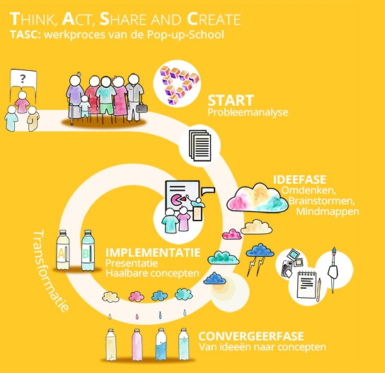 We kregen van Karin enkele (bekende 🙂 )creatieve werkvormen. Daarna vertelde zij en Jos meer over het eerste jaar van de pop-up school. Zij werken volgens de TASC-methode: Think, Act, Share and Create. Dit is een combinatie van people centered designthinking en creative problemsolving.